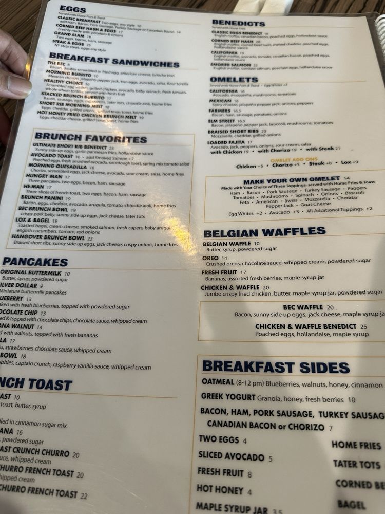 Bacon, pepper jack, broccoli, mushrooms and tomatoes. Served with home fries and toast.